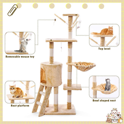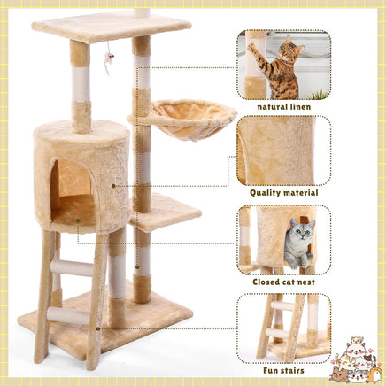 Centro de juegos para gatos: Están diseñados para que los gatos rasquen, trepen, duerman y hagan ejercicio.  Varios gatos pueden jugar en él al mismo tiempo, los gatitos pueden afilar sus garras en los postes rascadores, tumbarse en perchas para gatos bien acolchadas, jugar con juguetes y esconderse en los condominios para gatos.  La apariencia cálida y elegante lo convierte no solo en una moderna torre para gatos, sino también en un mueble atractivo que es a la vez ornamental y práctico.