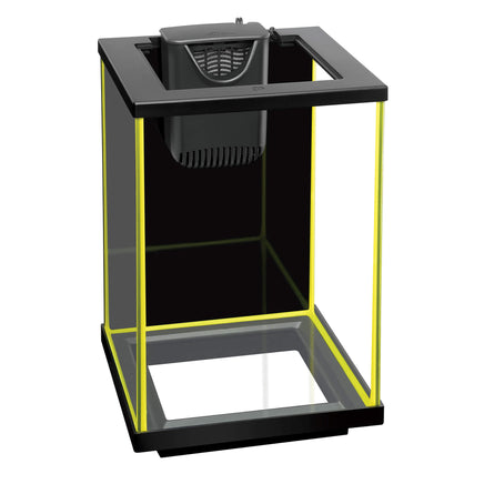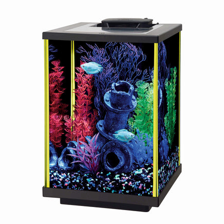 ¡Los kits de acuario LED NeoGlow añaden diversión y color a cualquier habitación! Estos kits cuentan con un tanque de vidrio con silicona de colores que emite fluorescencia bajo una iluminación LED azul. Dentro de cada kit hay plantas decorativas y grava multicolor a juego. También se incluye: filtración de energía QuietFlow, campana de perfil bajo con iluminación LED azul, respaldo negro, cartucho de filtro, muestras de alimentos y cuidado del agua para peces y guía de configuración.