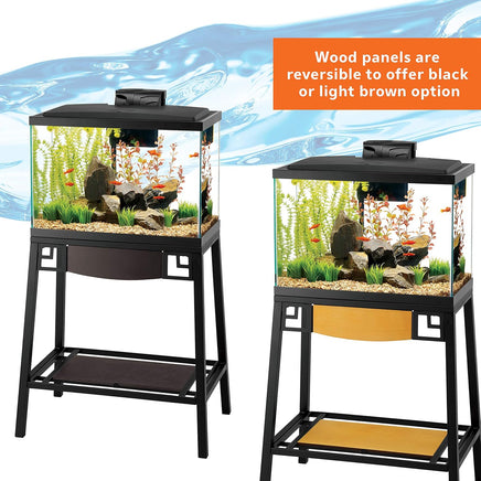 Los muebles para acuarios Aqueon Forge ofrecen la flexibilidad que buscan los aficionados. Los paneles de madera reversibles permiten elegir el color: negro o marrón claro. Cada soporte cuenta con un estante inferior que puede usarse para un segundo acuario o para exhibir la decoración del hogar. El panel central de madera se levanta para facilitar el acceso al estante inferior. Su construcción de acero proporciona una gran durabilidad y cuenta con un acabado con recubrimiento en polvo resistente a la oxidación.