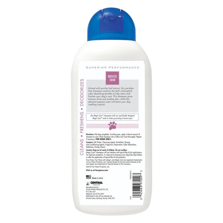 Especialmente formulado con compuestos neutralizantes de olores para eliminarlos, el champú para perros Magic Coat Reduces Odor ofrece resultados frescos. Duro con la suciedad pero suave con la piel de su perro, este champú desodorante para perros está impregnado de extracto de hoja de perejil. La clorofila de la hoja agrega beneficios de absorción de olores para dejar el pelaje con olor a limpio. Además, le proporciona a su perro un pelaje lustroso y un aroma a papaya tropical. ¡Sin parabenos ni colorantes, este champú se fabrica con orgullo en los EE. UU.!