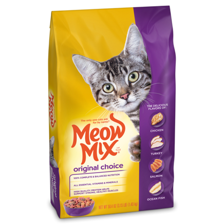 Alimento con los deliciosos sabores del pollo, pavo, salmón y pescado del océano, los gatos piden comida para gatos Meow Mix® Original Choice por su nombre. Es la combinación perfecta para ayudarte a conectarte con tu gato durante una comida saludable.