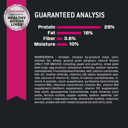 Eukanuba Adult Small Breed Dry Dog Food es una nutrición completa y equilibrada para perros de raza pequeña mayores de 12 meses y con un peso de hasta 23 lb.  Una combinación de proteína animal, glucosamina y sulfato de condroitina promueve el desarrollo de músculos magros y la salud de las articulaciones en perros activos de razas pequeñas. El DHA y vitamina E apoyan la función cerebral saludable y ayudan a mantener a los perros pequeños en forma.  Los niveles óptimos de grasas y carbohidratos alimentan un estilo de vida activo. El pollo de alta calidad es el primer ingrediente de la proteína que potencia su día.