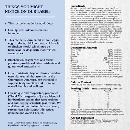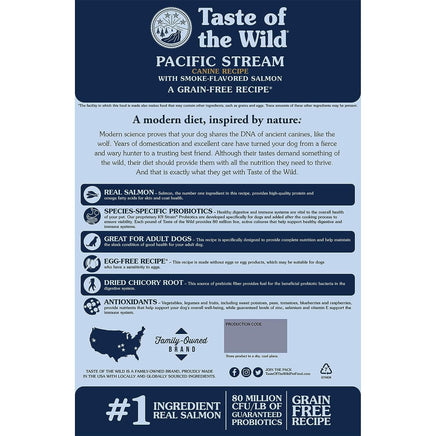 Taste of the Wild Pacific Stream es un alimento seco para perros con salmon con sabor a humo; pescado real es el ingrediente #1; alto en proteínas (32 %) para ayudar a mantener los huesos, las articulaciones y los musculos; es rico en nutrientes y proporciona la energía para prosperar; vitaminas y minerales de superalimentos; Ácidos grasos omega para una Piel y un Pelo sanos. Cada porción incluye altos niveles de probioticos de la cepa K9 específicos de la especie, además de antioxidantes y prebióticos, para ayudar a apoyar una digestión saludable, el sistema inmunológico y la salud y el bienestar en general. PROPIEDAD FAMILIAR y FABRICADO en los EE. UU. utilizando ingredientes de calidad de fuentes nacionales y globales confiables.