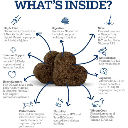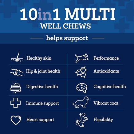 Vetality® 10in1 Multi Well Chews for Dogs es una mezcla multifunción avanzada para la salud general de su perro. Este suplemento ayuda a mantener una piel saludable, la salud de la cadera y las articulaciones, la salud digestiva, el apoyo inmunológico, el apoyo cardíaco, ayuda con la salud cognitiva, apoya un pelaje vibrante, aumenta el rendimiento y la movilidad, y tiene antioxidantes que ayudan a reducir el estrés. A los perros les encantan estos masticables con sabor a pollo. Para perros de todas las edades y tamaños.