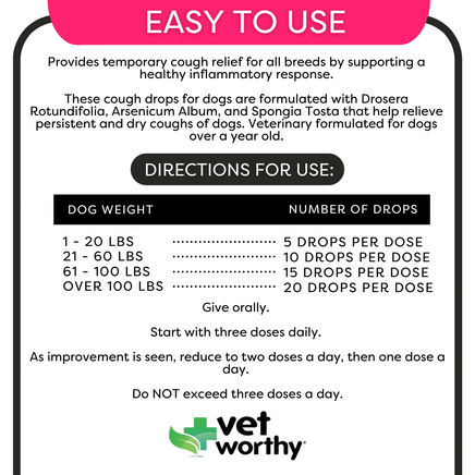 Alivia temporalmente la tos en perros de todas las razas, favoreciendo una respuesta inflamatoria saludable. Estas gotas para la tos están formuladas con Drosera Rotundifolia, Arsenicum Album y Spongia Tosta, que ayudan a aliviar la tos persistente y seca. Formulado por veterinarios para perros mayores de un año. Práctico y fácil de usar. Estas gotas para la tos vienen en un frasco con gotero de plástico para facilitar su uso. Aplique tres gotas al día en la boca de su perro y reduzca la dosis a dos o hasta una al día si observa mejoría.